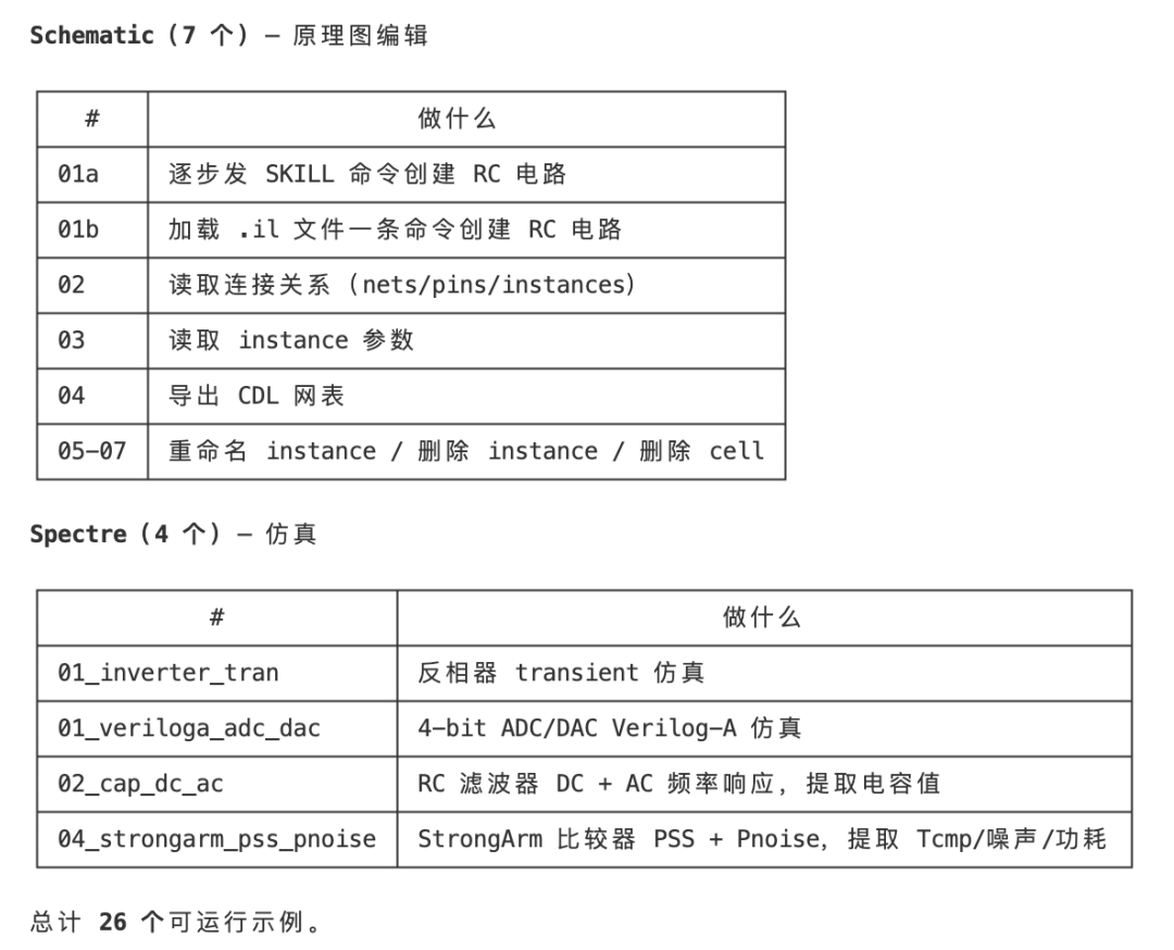 基础连接与验证,原理图、版图的增删查改,读库、读图,各类仿真。