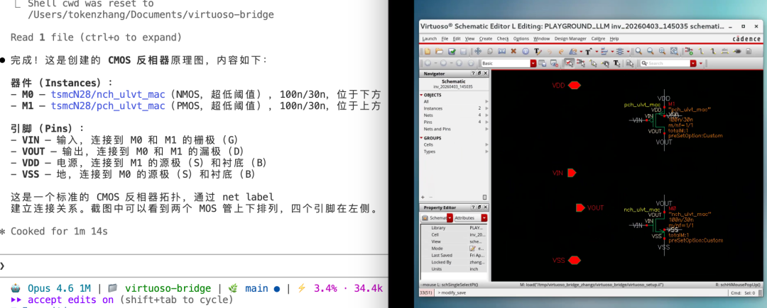 Agent 加载后即可具有原理图编辑、版图绘制、仿真优化的自主操作能力。