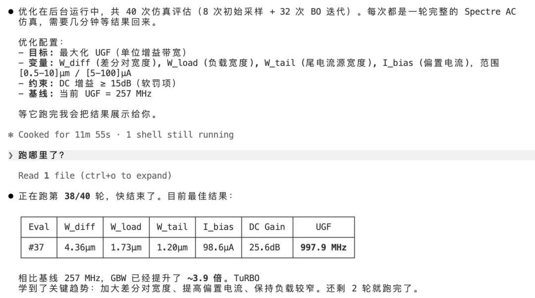 我们也打通了修改网表、数据传输、调用 Spectre 仿真、回传及解析结果的链路。