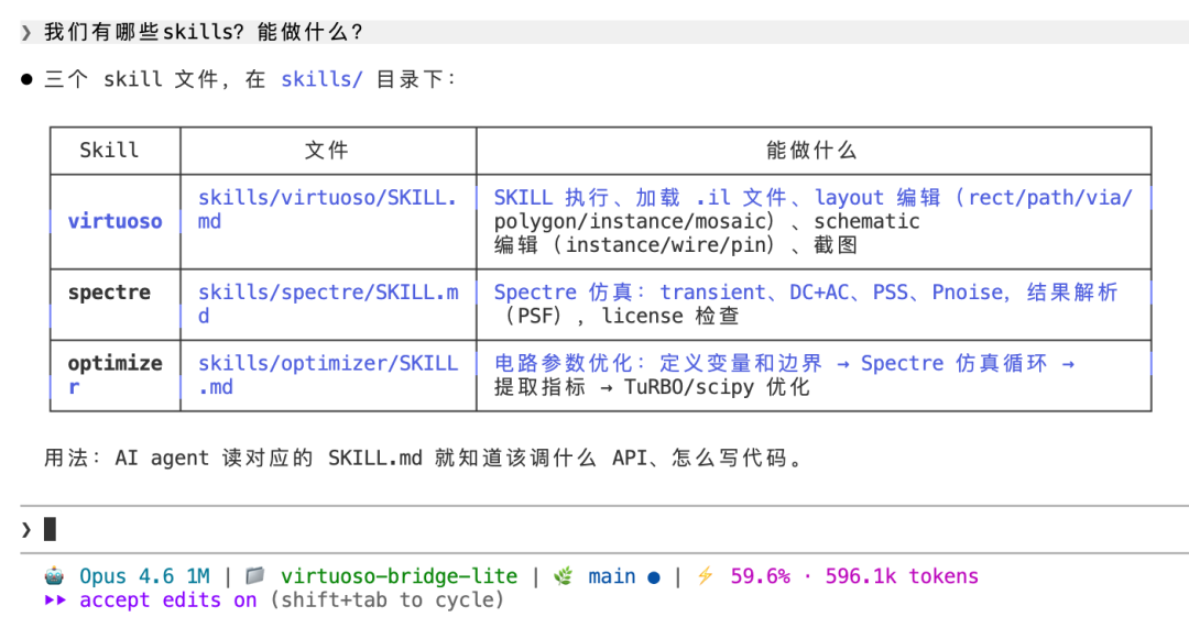 内置技能包(Skills): 封装了 Virtuoso、Spectre、Optimizer 三大核心模块。